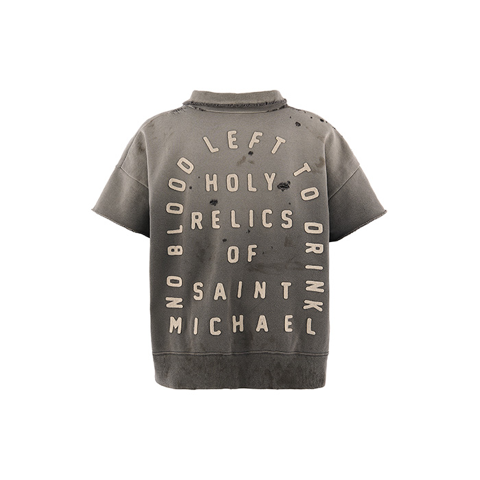 フェードしたチャコールグレーボディに、ダメージや汚し、アーチ状の“SAINT”レタリングを落とし込んだハーフジップ仕様のショートスリーブトップ。