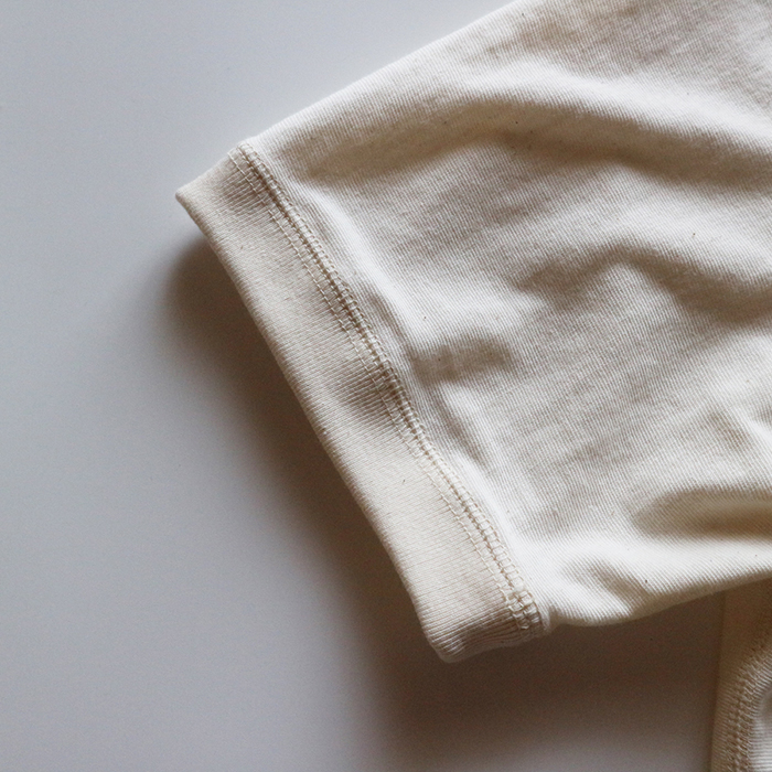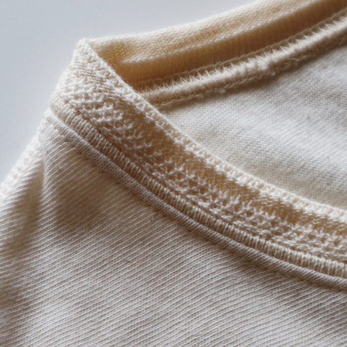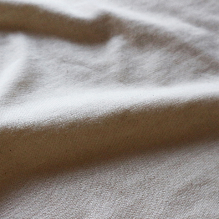 生地は、1900年代初頭に日本へ導入され、現代では和歌山でわずか200台ほどのみしか稼働していない希少な『旧式吊り編み機』で、ゆっくり