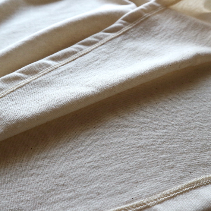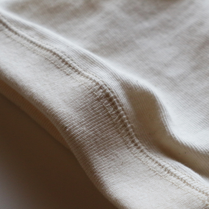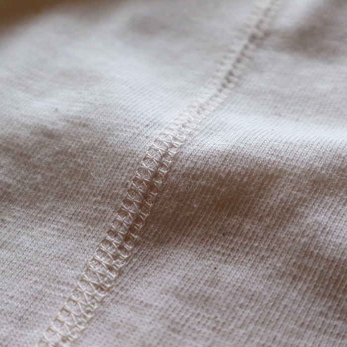 上げて行く生産性の非常に低い吊り編み機の生地は、20年以上の経験値が必要とされる職人の操作により、丁寧かつ緻密に編み立てられる希少素材。その独自の機械構造と編み組織は、編み立て時、糸に引っ張りを全く与えず、糸本来の柔らかな風合いを活かしたまま、ゆっくりと密度を詰めて編むことが出来るため、現代の高速機で編まれた同素材の生地よりも、肌当たり、密度、伸縮性、耐久性、風合いに優れた生地として作り上げることが可能となり、太番手の綿糸を用い、吊り編み機で時間をかけ編み上げた肉厚のある生地は、長く着ることができ、肌当たりも優れるため着心地も良く、着続けていく程に増していく生地風合いも楽しめる上質な素材となっています。