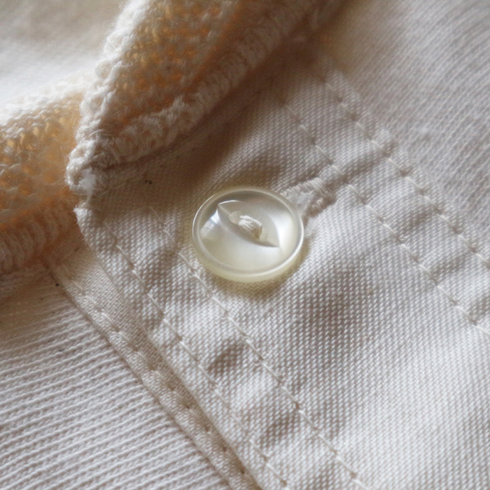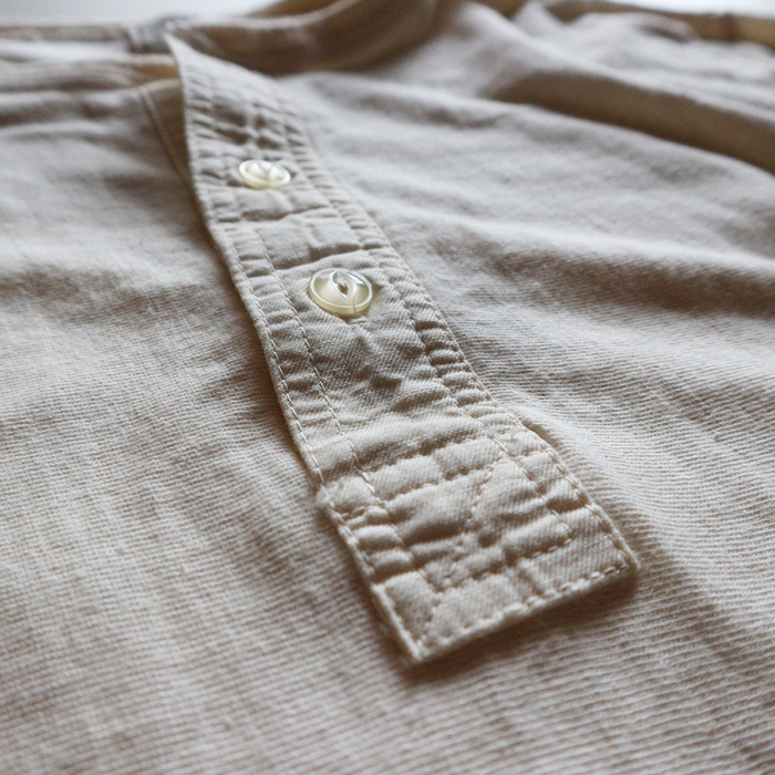 形は、60sのヘンリーネックシャツから着想を得たデザイン。ダブルステッチで時間をかけ縫い上げる布帛仕立ての前立て、衿は特殊な編み機で一人分づつ編み上げた贅沢なジャガード編みのヴィンテージネック、袖口はワイドリブが配置された存在感のあるディテールとなっており、縫製は熟練技術者による4本針フラットシーム、2本針縫製等で縫い代の凹凸を抑え、着心地、ステッチワークをポイントとした手間と技術を